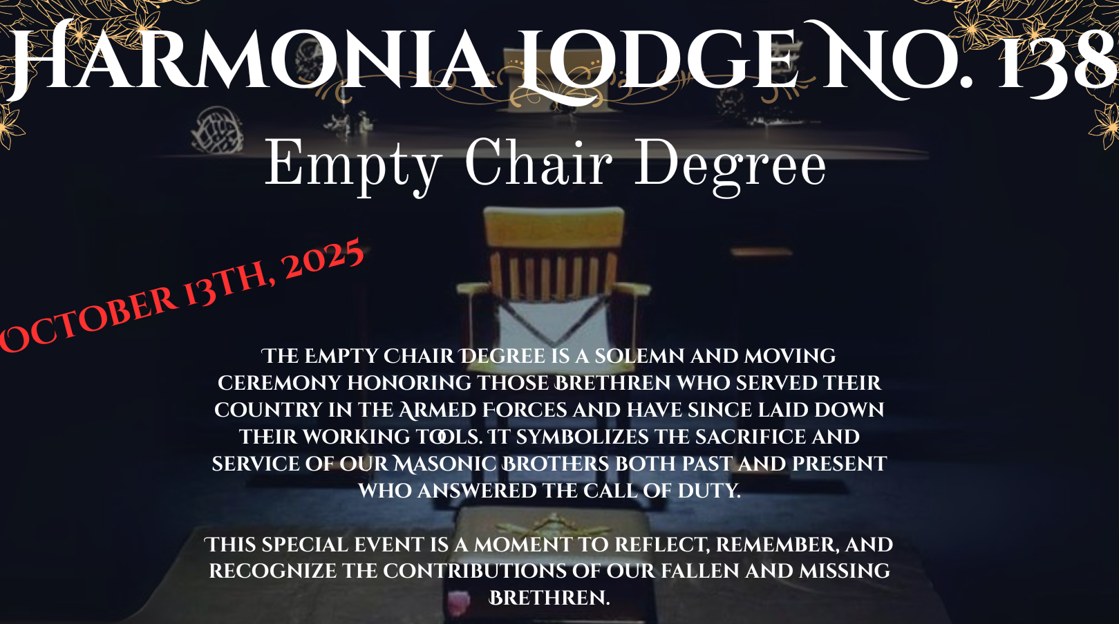 Empty Chair Degree / Stated Communication October 14, 2025 @ 6:30 pm - 10:00 pm Harmonia Lodge No. 138 F & AM 1896 Palm Beach Lakes Blvd. #200, West Palm Beach, FL, United States Dinner 6:30 PM / Meeting 7:30 PM